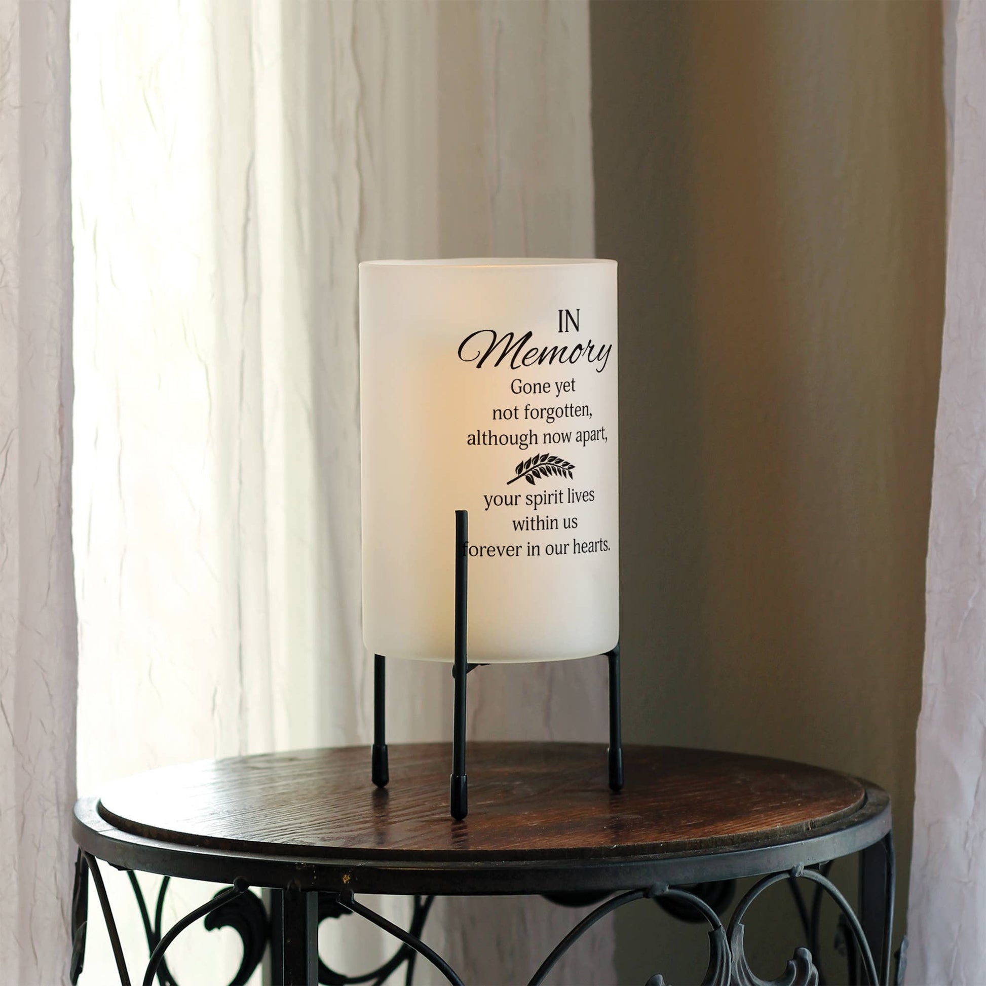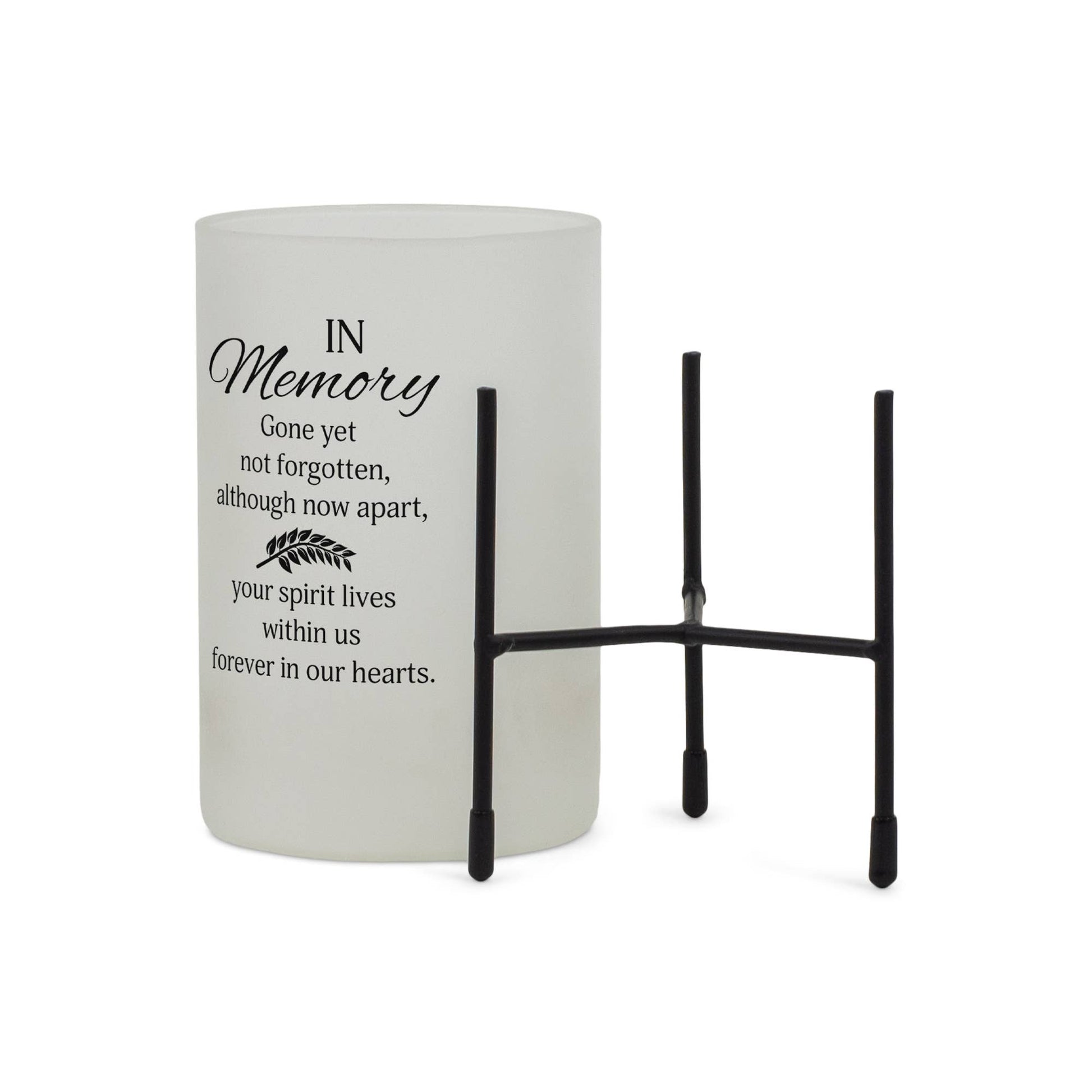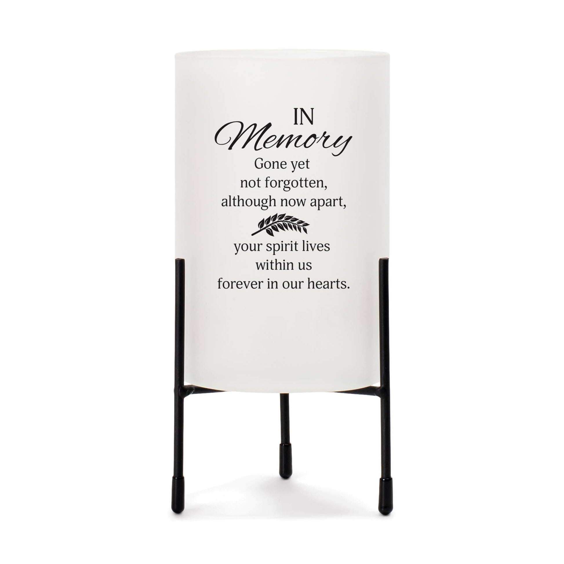 This hurricane style glass candle stand is a beautiful way to illuminate and convey a heartfelt message of condolence. Frosted white glass is decorated with a sentiment on the outside. Holder nestles in its own black metal stand with padded feet to protect furniture. Overall size of holder in stand is 8" high x 4" diameter width. Words on holder: In Memory - Gone yet not forgotten, although now apart, your spirit lives within us forever in our hearts.