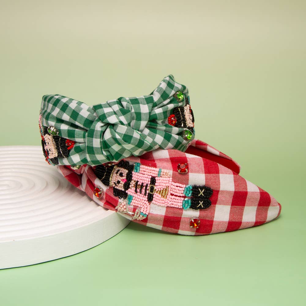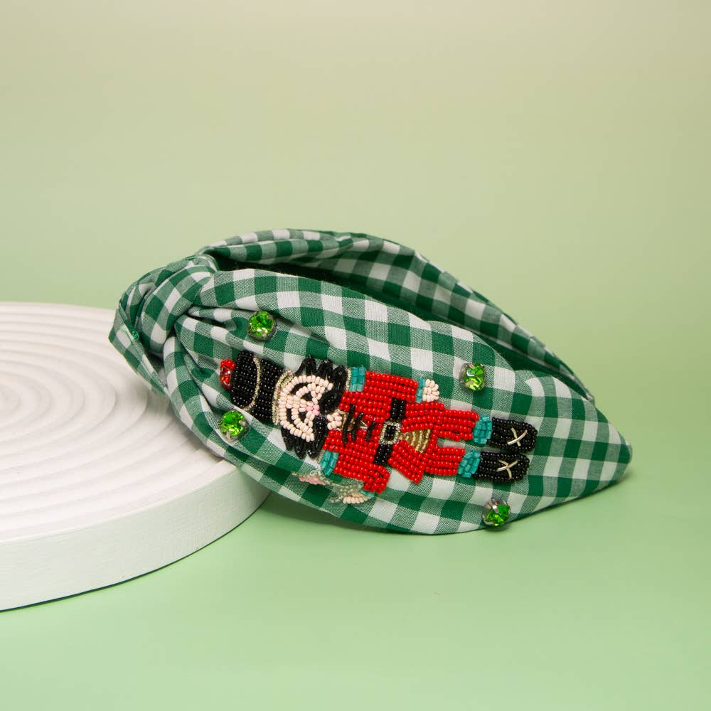 This festive top-knotted headband features a playful Nutcracker motif embellished with intricate seed beadwork, sparkling crystals, and a whimsical martini glass accent set against a gingham-style base. Lightweight yet bold, it combines holiday glamour with a fun celebratory theme. The flexible, comfortable band ensures a secure hold for daylong wear, while the top knot adds stylish height and flair, making it both eye-catching and practical.