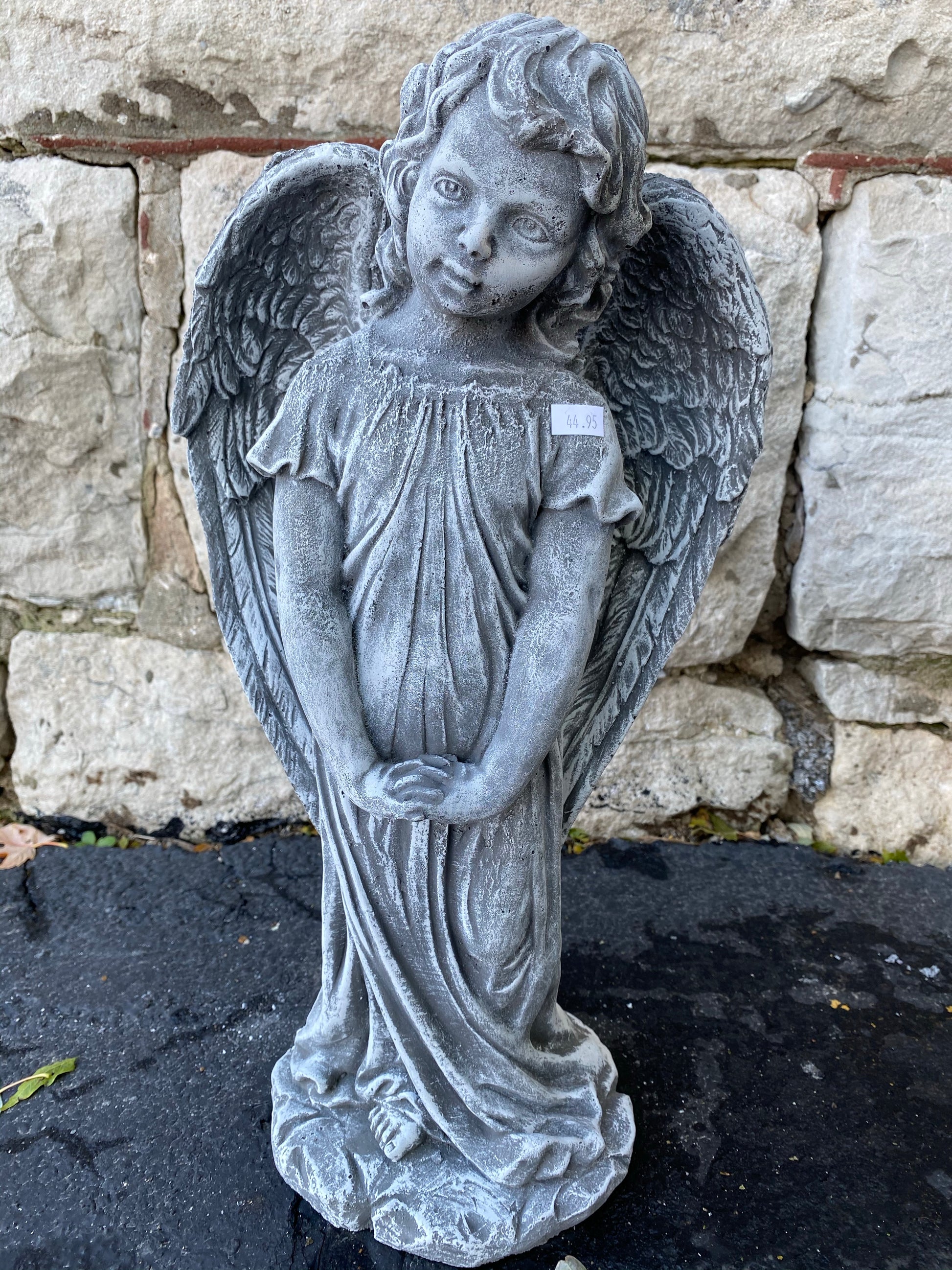 Standing cement angel with a flowing gown and her hands folded. Perfect addition to any garden or memorial gift