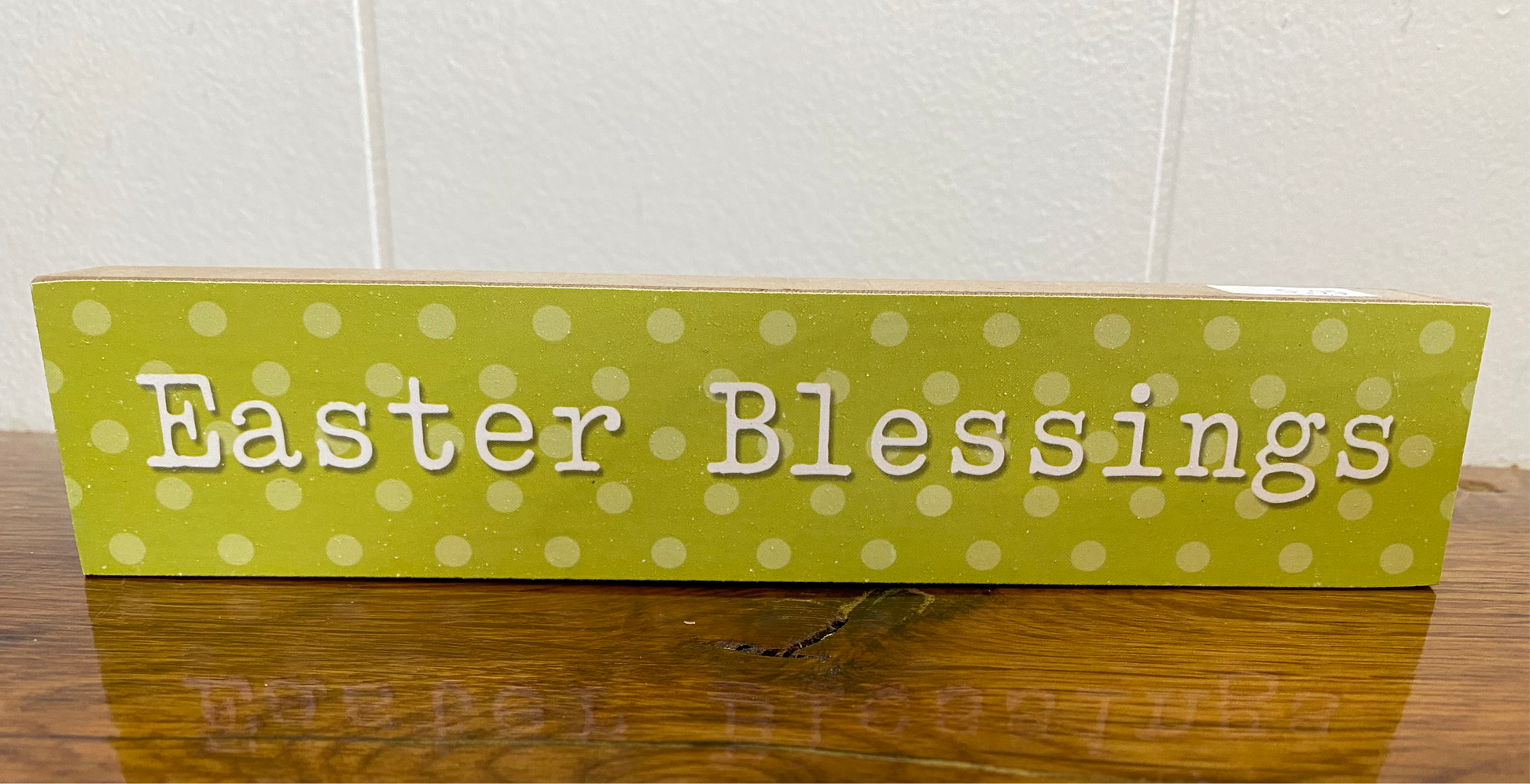 This sign features a wood rectangle base with white polka-dots on green. In the center, the sign reads: "Easter Blessings" all in white lettering. The sign measures 7.25 inches long.