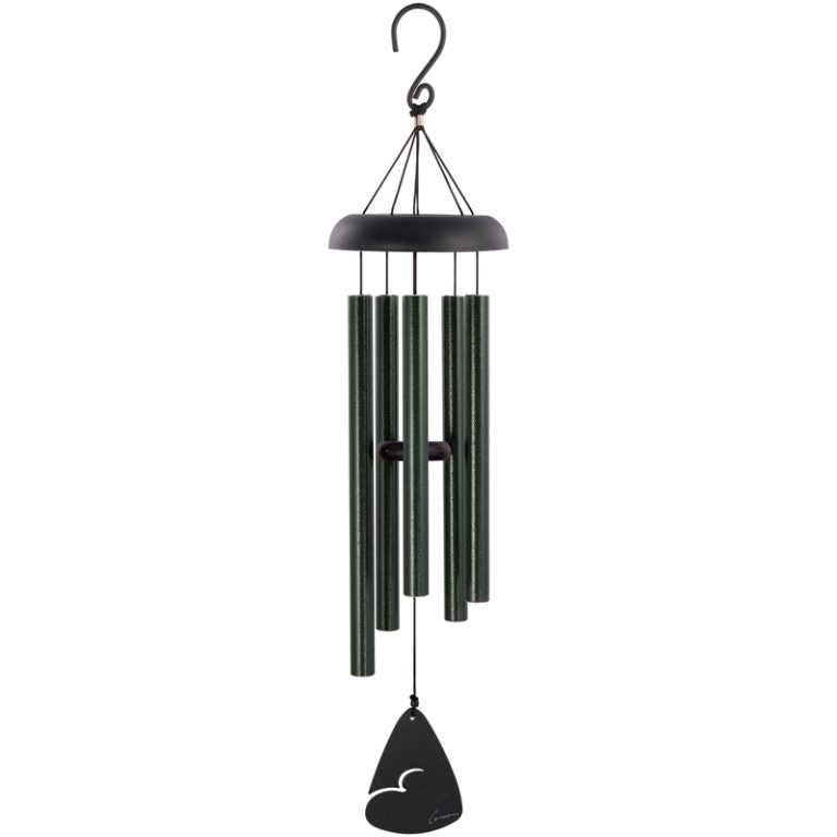 Chime has 5 heavy walled, center pinned tubes that emit a soothing and serene sound. Durable powder coated finish, all aluminum construction, and strung with industrial cord. Includes an adjustable striker.