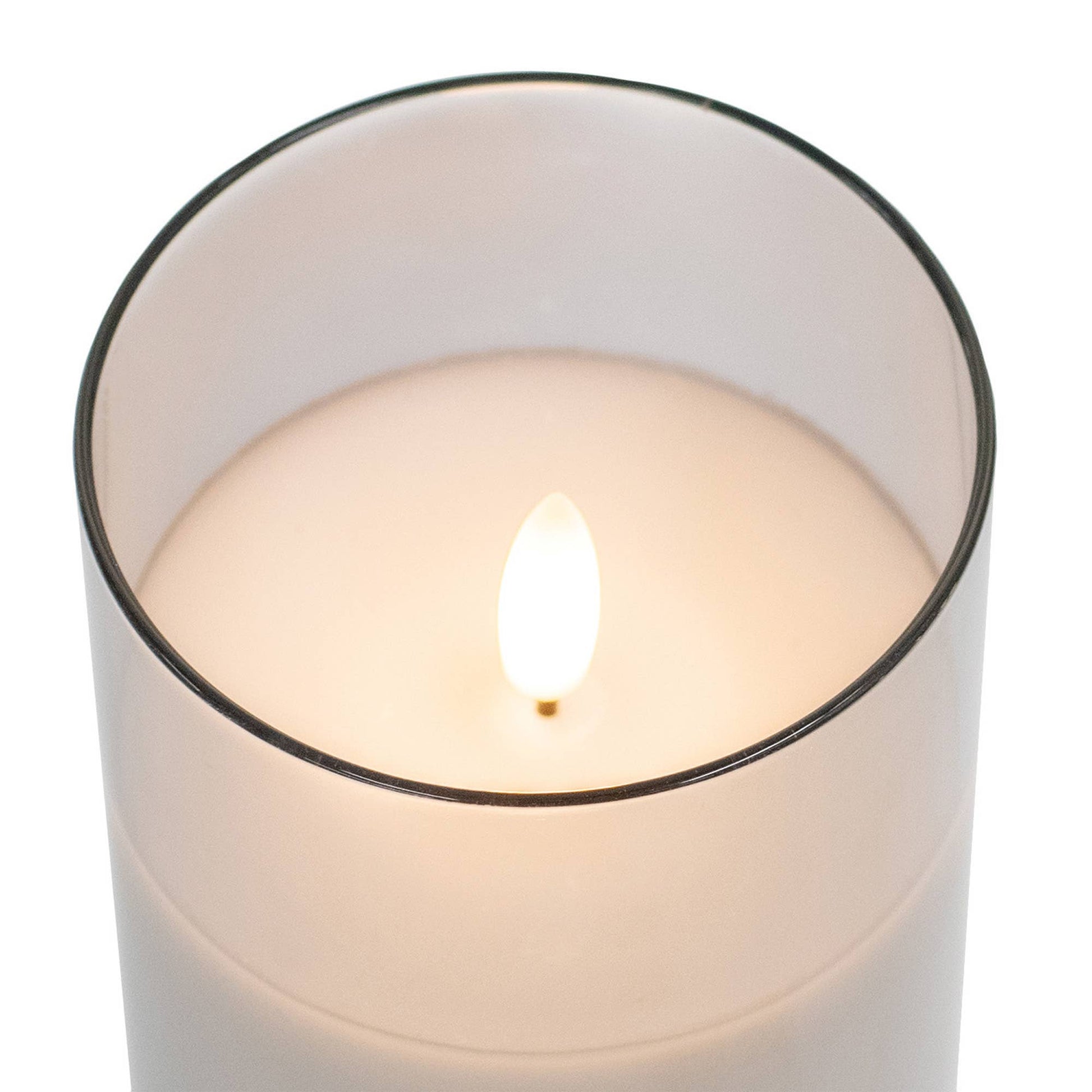 Flameless pearlized grey LED glass candle that says: You are wished a happy retirement. 6in tall LED candle has a flickering flame appearance; 3in diameter.