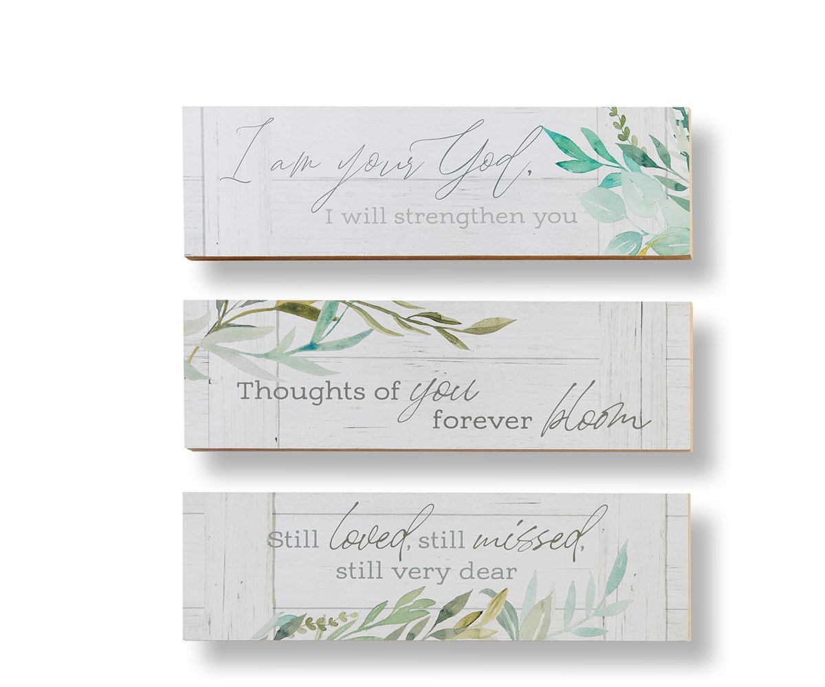 Plank design wall sign styled in muted hues of blue and green features a soothing sentiment. Available in 3 assorted designs: I AM YOUR GOD, I WILL STRENGTHEN YOU, STILL LOVED, STILL MISSED. STILL VERY DEAR, THOUGHTS OF YOU FOREVER BLOOM.