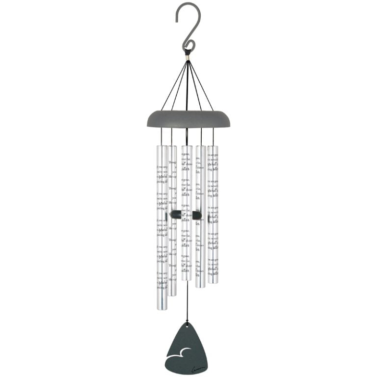 30" sonnet chimes have 5 heavy walled, center pinned tubes that emit deep tones. All aluminum construction, durable powder coated and anodized finish, and strung with industrial cord. Each chime has an adjustable striker. Tubes are 7/8" diameter, sentiment is printed directly onto the tubes.